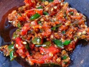 Untuk membuat sambalnya, haluskan semua bahan sambal menggunakan cobek dan ulekan. Namun, jangan terlalu halus unutk mempertahankan tekstur cabai.